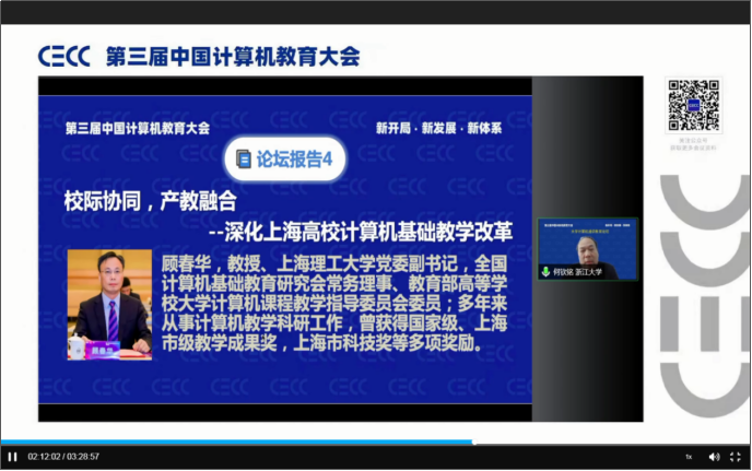 上海理工大学党委副书记,全国计算机基础教育研究会常务理事顾春华带来题为“校际协同,产教融合 --深化上海高校计算机基础教学改革”的报告。报告提到上海各高校在市教委的直接指导下,校际协同,制定“上海高校大学计算机课程教学改革参考方案”,并开展计算机基础教学改革项目,支持计算机基础教学教师进行教学改革;同时,大力改革考核方式和手段,加强产教融合,以考促教,取得较好成效。