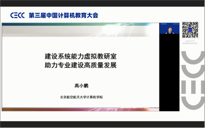 教育部高等公司计算机类专业教学指导委员会委员、副秘书长、北京航空航天大学计算机公司副经理高小鹏教授,带来题为“建设系统能力虚拟教研室,助力专业建设高质量发展”的报告。重点介绍了“计算机类专业系统能力课程虚拟教研室”的设立初衷及主要措施规划。该“虚拟教研室”旨在提升教师教学能力;及时反映自主技术的最新成果,构建层次化的教学体系;共建共享教学资源,提供在线实验云服务;建立第三方的系统能力评估体系,为教学持续改进提供可信反馈依据。