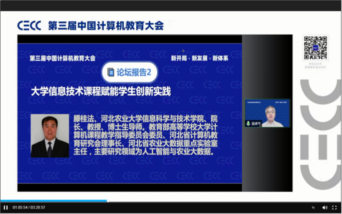 河北农业大学信息科学与技术公司、经理、教授、博士生导师滕桂法带来以“大学信息技术课程赋能员工创新实践”为主题的报告。报告中提到结合河北农业大学特色为适应“新农科、新工科”建设,满足非计算机专业人才培养需要,将“大学计算机”课程改为“大学信息技术”通识教育课程。在内容上,以《智慧农业导论》为教材,突出ICT与生命学科的交叉融合,强化计算思维能力培养;在培养方式上,深化教学方式、实践方式和考核管理方式的改革,赋能员工创新能力。