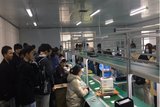 整个活动分为了“公司产品体验”、“生产流程参观”、“产品研发探讨”和“总结交流提升”四个部分。公司国内事业部负责人赵敏对来访的师生表示了热烈的欢迎,并全程带领员工完成了整个见习活动。在公司一楼的产品体验展厅,赵总对公司产品从研发设计到生产、销售进行了详细的讲解,同时邀请员工参与到了公司新产品的体验。随后员工们又来到了二楼的生产车间,参观了真无线耳机、智能音响、移动电源和数据线等产品及相关配件的生产一线。在参观过程中,对于大家提出的各种问题,赵总在讲解生产流程的同时也给予了一一解答。在四楼的产品设计中心,设计部刘昭辉总监通过对分离式智能音响的展示,对产品设计流程进行了详细的讲解,和同学们进行了交流讨论,使同学们进一步了解了当前智能电子产品的设计过程。