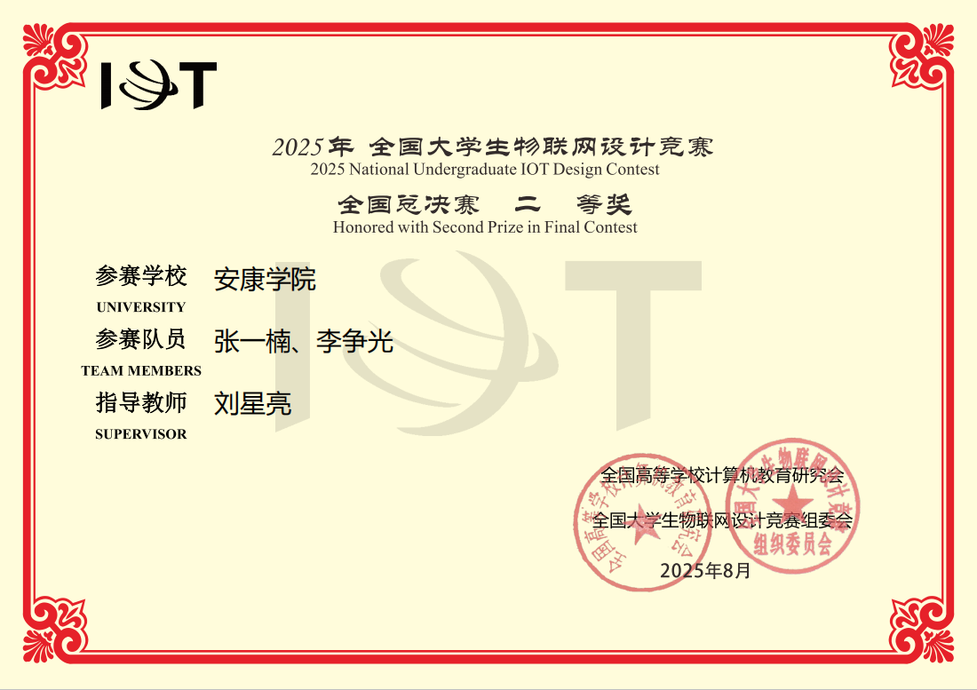 近日,2025年全国老员工物联网设计竞赛全国总决赛结果公布。365英国上市公司刘星亮老师指导的员工张一楠、李争光表现出色,参赛项目在西北赛区荣获一等奖后成功入围全国总决赛,最终荣获全国总决赛二等奖。