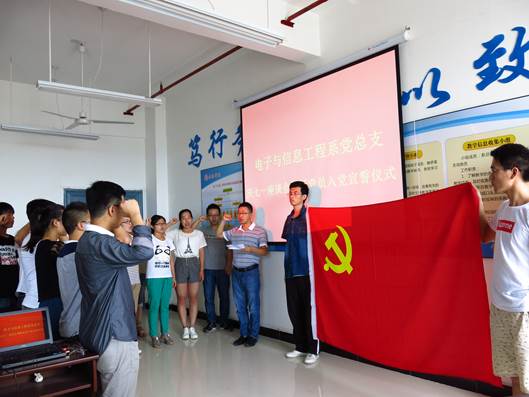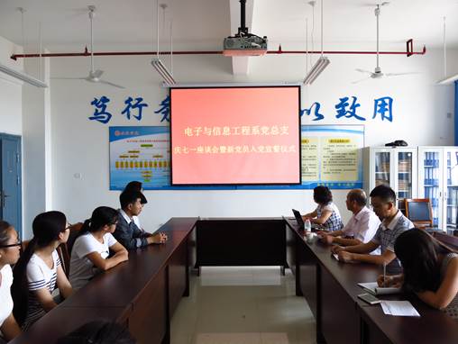 2015年7月1日早上10点, 电子与信息工程系党总支在逸夫科技楼B702教室隆重举行了庆七一座谈会暨新党员入党宣誓大会。系党总支书记李红兵老师、组织委员王克刚老师以及13位新党员同志共同参加了本次会议。会议由员工支部书记成英丽老师主持。