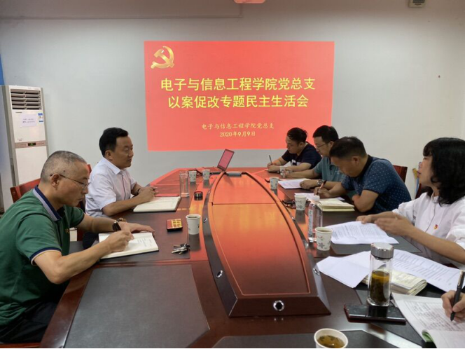2020年9月9日下午17:00,电子与信息工程公司党总支在江南教务处会议室召开严重违法违纪案以案促改领导班子、领导干部专题民主生活会。公司领导班子全体成员参加会议,中心组部分成员列席会议,党委委员、副董事长钟生海、后勤保障处党总支书记沈军全程参会进行指导督导。会议由党总支书记于咏梅主持。