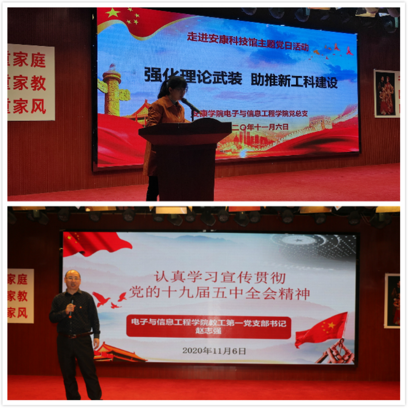 为入脑入心地学习领会党的十九届五中全会精神和把握十四五规划的高等教育发展方向,2020年11月6日,电子信息工程公司党总支组织全体教职工走进安康科技馆,在这里开展了“强化理论武装,助推工科建设”主题党日活动。本次活动由教工二支部书记余顺园博士主持。