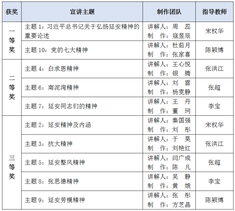 本次活动中,公司党总支精心策划、专业教师认真指导、员工党员和青年员工积极参与,认真撰写讲稿,精心拍摄视频,共制作出10期宣讲微视频,经评审小组评定,党总支委员会审定,评选出了一、二、三等奖,其中一等奖2名,二等奖3名,三等奖5名,并给予奖励。
