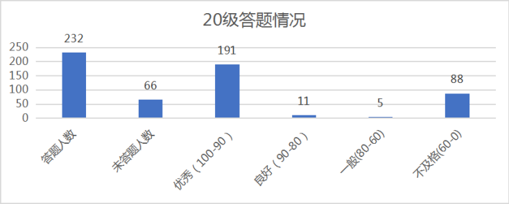 本次比赛共有766名同学参与,参与率达到85%以上,优秀率达到62%以上,其中2019级参与人数最多、参与率最高;2020级优秀人数最多、优秀率最高。在众多班级中又以2018级物联网工程1班成绩最佳,摘得大赛魁首。