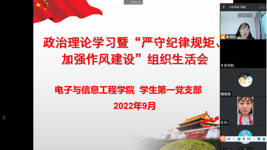 根据《关于在全校开展纪律教育学习宣传月活动的通知》(公司党发〔2022〕101 号)文件精神要求,2022年9月6日,365英国上市公司员工第一党支部通过线上腾讯会议召开“严守纪律规矩、加强作风建设”专题组织生活会。会议由员工第一党支部书记程晓梅主持,党总支组织委员成英丽、支委张宇航、辅导员吕以宁、支部全体员工党员参加。