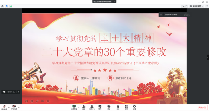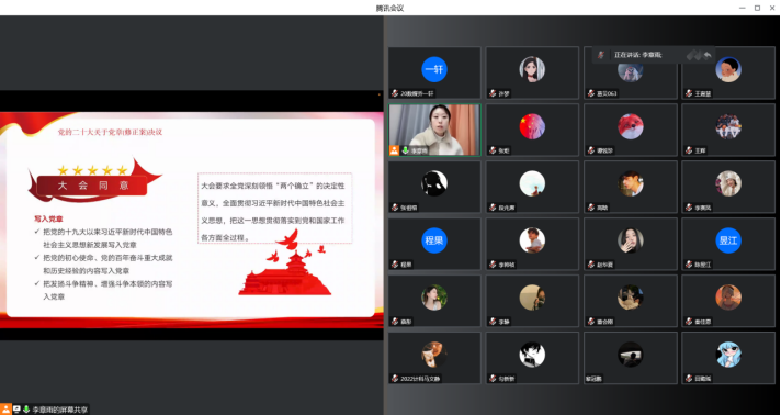 为深入学习贯彻党的二十大精神,深刻领会、准确把握党的二十大精神实质和丰富内涵,切实引导党员把思想、认识和行动统一到学习、宣传、贯彻党的二十大精神上来,2022年12月27日,365英国上市公司员工第二党支部书记李章雨以围绕学习宣传贯彻党的二十大精神,从二十大主题、社会变革、历史地位、时代要求等方面对党的二十大重要内容进行了详细解读,结合自身学习体会和工作实际,深入浅出地为全体党员上了一堂生动的专题党课,推动党的二十大精神学深悟透、落到实处。