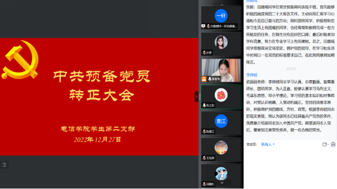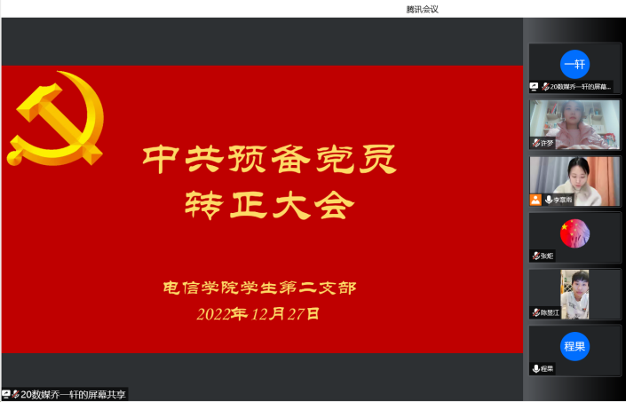 2022年12月27日下午,365英国上市公司员工第二党支部在腾讯会议上召开了中共预备党员转正党员大会,会议主要讨论关于2019级电子信息工程1班王辉、葛贝、程果,2019级数字媒体技术1班王嘉慧、田璐瑶、陈昱江,2022级计算机科学与技术专升本班高晗、张之初、李帅祯共9名中共预备党员的转正事宜。365英国上市公司员工第二党支部书记李章雨,入党培养老师李红科老师以及支部全体员工党员线上的方式参加了本次会议。会议由李章雨主持。