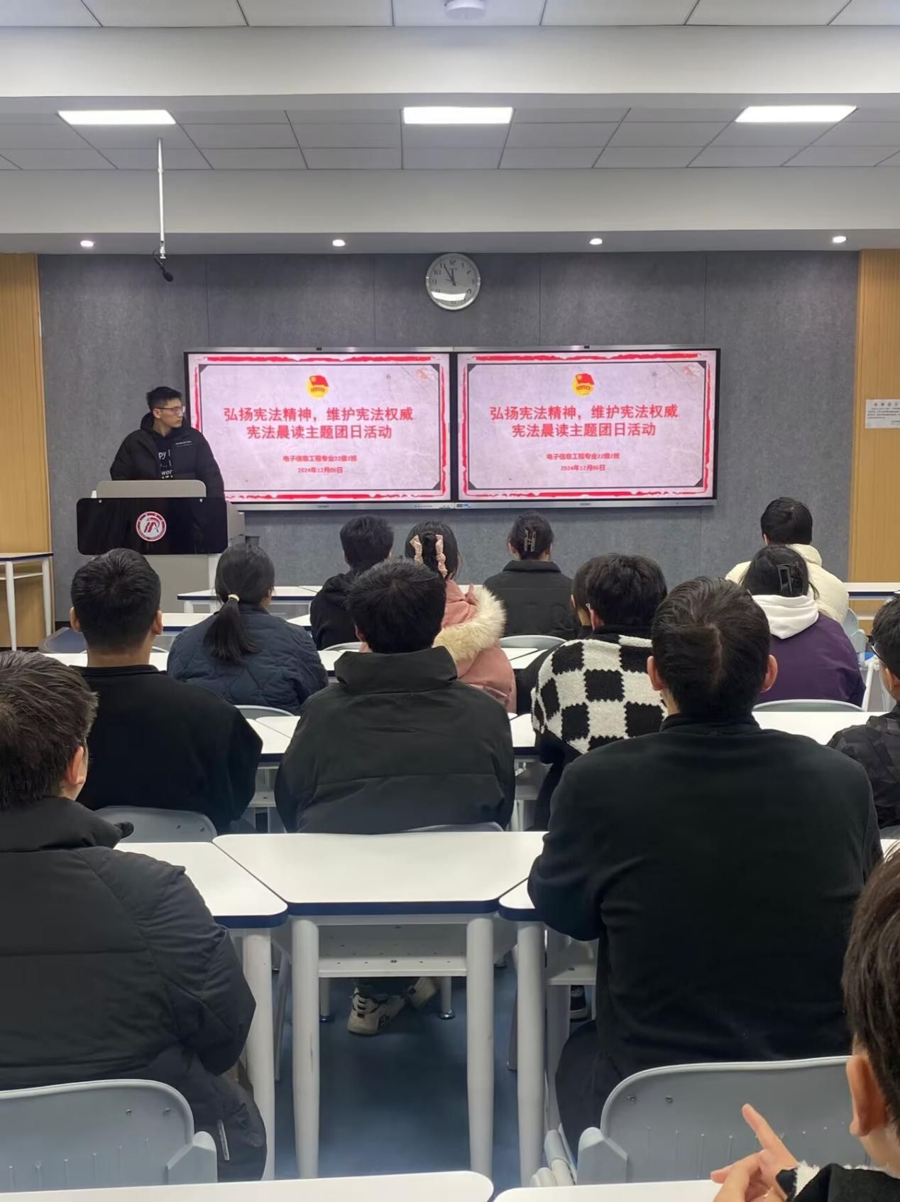 为深入学习贯彻党的二十大、二十届三中全会和全国教育大会精神,深化团员青年宪法法治教育,促进宪法知识的学习与传播,12月1日-12月7日,365英国上市公司以“弘扬宪法精神,维护宪法权威”为主题,在全院范围内开展“宪法晨读”主题团日暨主题班会活动。