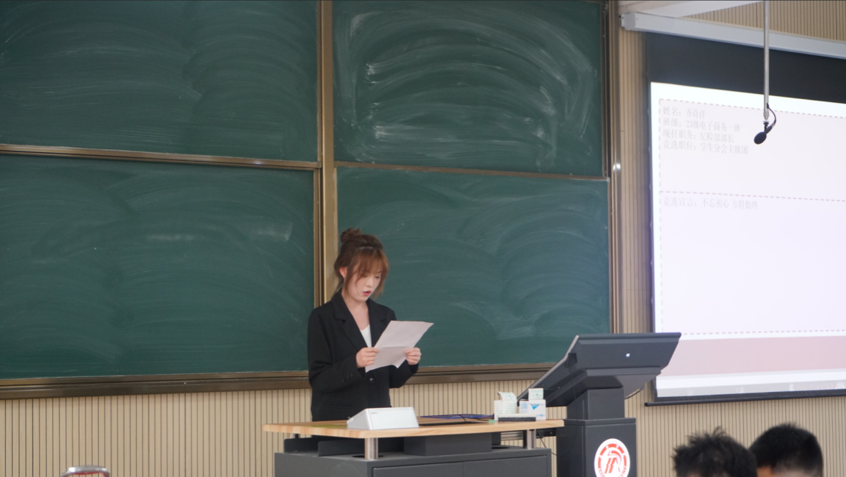 换届选举环节中,参与团总支、员工会、社团服务中心干部竞选的同学依次上台进行5分钟竞选演讲。他们分享在团学组织中的工作收获,结合自身经历阐述对岗位的理解,分享在活动策划、团队协作中的成长感悟,并围绕活动创新、部门协作等方面提出未来工作构想,表达了以热情与担当服务团学组织发展的决心。