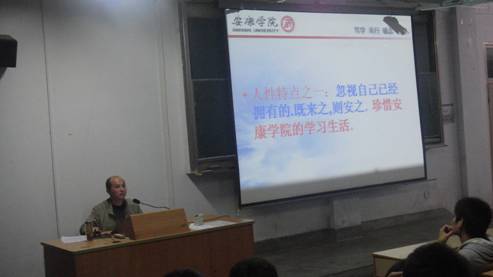 9月20日晚,系党总支书记李红兵在1510室为2011级新生做了题为《从中员工到老员工的角色转换》的入学教育专题讲座。