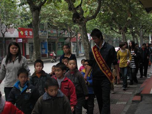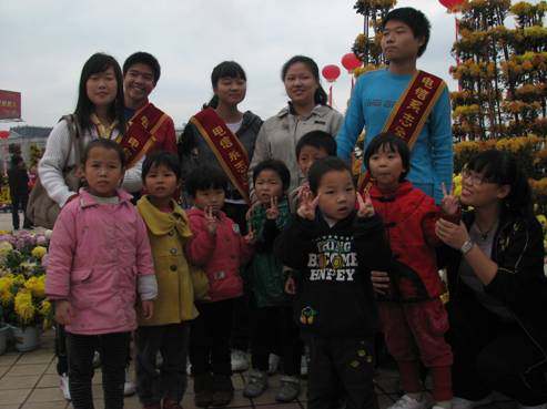 2011年10月5日,电子与信息工程系志愿者本着“奉献、友爱、互助、进步”的宗旨,来到安康阳光公司,协助“樱桃班”的老师带领小朋友们到金州广场观看菊花展。