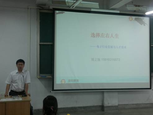 2012年5月22日,电子与信息工程系在1号教学楼1510室举行职业教育报告会,邀请北京凌阳爱普科技有限公司总监刘立强做了“选择左右人生——电子行业发展与人才需求”主题报告会。电信系副主任陈守满,辅导员成英丽以及2013届电子信息工程专业90余名员工参加会议。