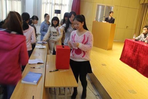 大会审议通过了第二十六届员工分会的工作报告,本次学代会共有20名同学参加员工分会委员的竞选,他们利用PPT的方式向代表们进行了自我介绍。各位代表认真履行自己的职责,本着明主、公平、公正的原则,采用无记名投票的方式产生了第二十七届员工会干部,有17名同学当选第二十七届员工会委员会成员。