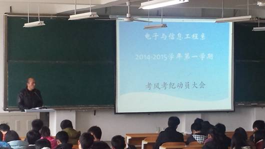 2015年1月8日,电子与信息工程系在1301教室召开期末考试考风考纪动员大会,大会由员工办公室副主任石纭昊主持。