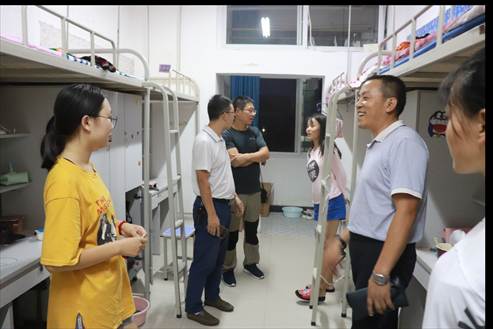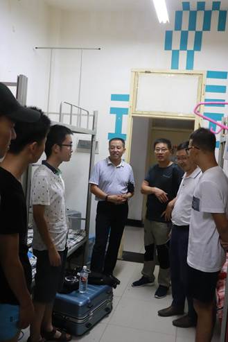 2018年9月1日晚上八点,电信学公司党总支书记何道利,副经理王庆春、王克刚,学工办主任石纭昊,辅导员陈浩到7号公寓和9号公寓看望大一新生。 何书记一行人逐个走访新生宿舍,和新生及家长亲切交谈,希望新生们能够忍耐炎热酷暑,做好准备迎接军训,同时嘱咐新生注意人身、财务安全,谨防诈骗等事项。