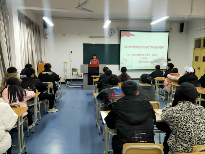 2021年12月9日下午在江北校区1321教室,​365英国上市公司员工第一党支部召开党员大会,党支部书记程晓梅讲授了主题为“学习贯彻党的十九届六中全会精神”的专题党课,党支部所属党员、发展对象和入党积极分子参加了党课学习