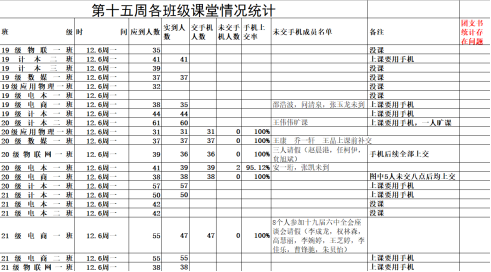 “无手机”课堂实行以来,虽然刚开始时有个别同学认为“没有手机很不习惯”,但一段时间以后,员工们都能自觉地将手机放入收纳袋里,课堂上的学习氛围以及教学效果都有了很大的提升。针对开展过程中各班课堂秩序汇报存在的问题,以及教师课后的反馈情况,“无手机”课堂针对存在问题进行了整改和完善:一是部分员工拖延或者不愿上交手机,耽搁老师上课时间。对此,要求团支书拍摄照片时员工姓名、水印要清晰可见;统计信息按要求格式备注未到课人员以及未上交手机员工姓名;照片和所统计的信息要同时发出;二是部分员工参与积极性难以维持,课前上交手机,课间拿回手机。对此,要求每班把放置袋置于讲台旁,及时关注上交情况并统计上交率,团总支办公室以周为单位整理周汇总;三是部分员工交手机后,在课上睡觉或者做别的事,对此,团总支实践部对每班进行不定时的课堂巡查,制定了2021-2022第一学期课堂巡查表。