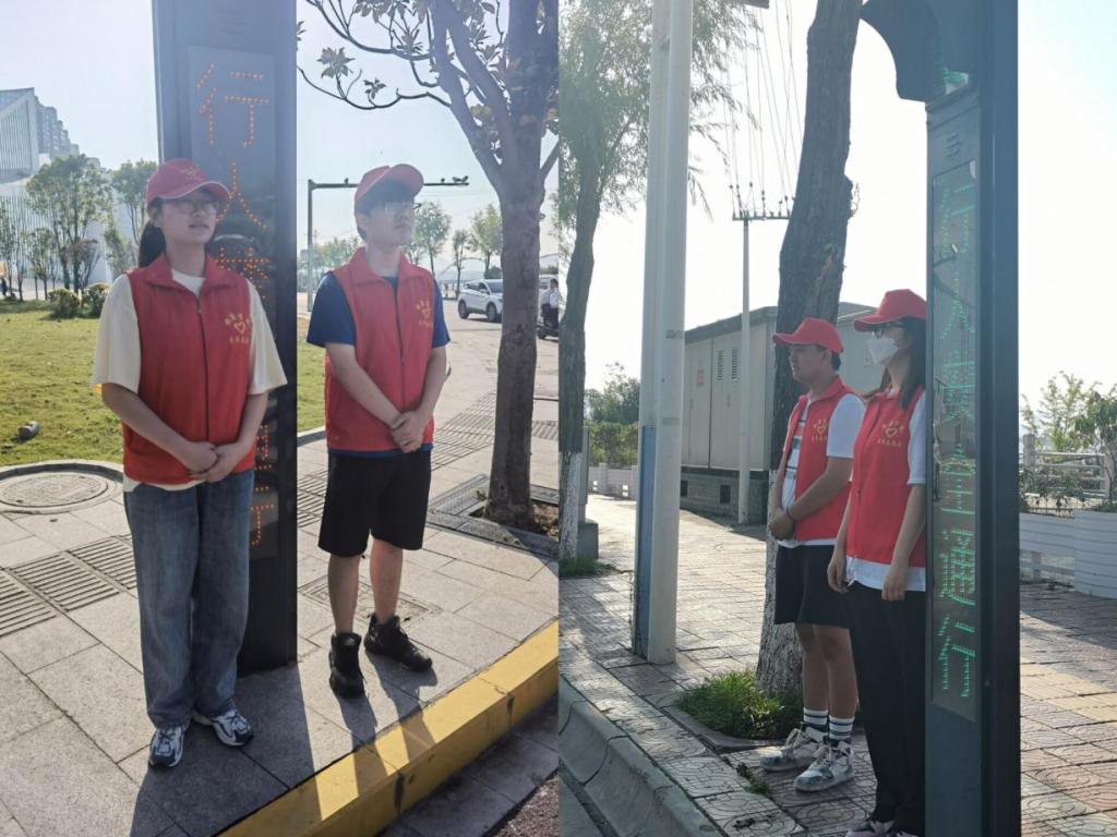 同时,设立交通文明劝导岗,由志愿者同学担任劝导员,负责维护交通秩序,守在交通路口耐心劝导行人和非机动车遵守交通规则,勿乱闯红灯、乱穿马路,并对问路的行人提供热情的帮助,为他们排忧解难。