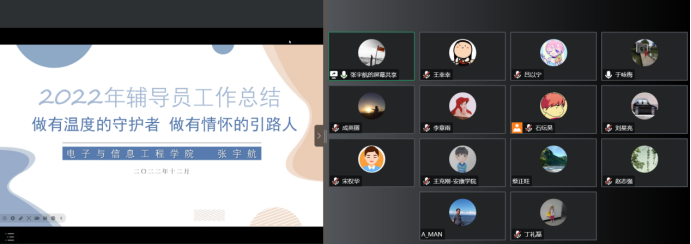 张宇航表示在过去的一年里,始终本着“以员工为本,为员工服务”的原则,坚决落实辅导员九项职能,坚持知行合一,践行育人使命,强化班团建设,努力做到坚定辅导员理想信念,助力员工“成长”;涵养辅导员道德情操,助力员工“成人”;提升辅导员专业能力,助力员工“成才”;倾注辅导员仁爱之心,助力员工“成功”。