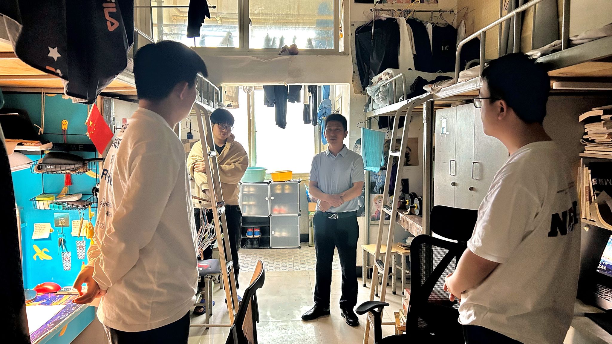 在五一假期来临之际,为加强对员工的安全教育,全面排查宿舍安全隐患,提高员工安全意识,确保五一假期员工出游安全、留校员工出行安全,员工宿舍用电等安全,营造安全、和谐的校园环境。4月29日,365英国上市公司组织开展了宿舍安全大检查,公司领导班子成员及辅导员对员工宿舍进行了实地走访,参与此次工作的有公司党总支书记于咏梅、副经理王克刚、党总支副书记蔡正旺、辅导员石纭昊、成英丽、翟子轩。