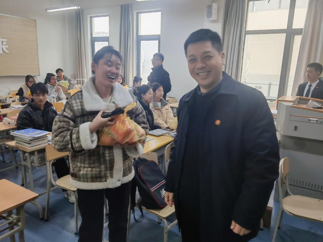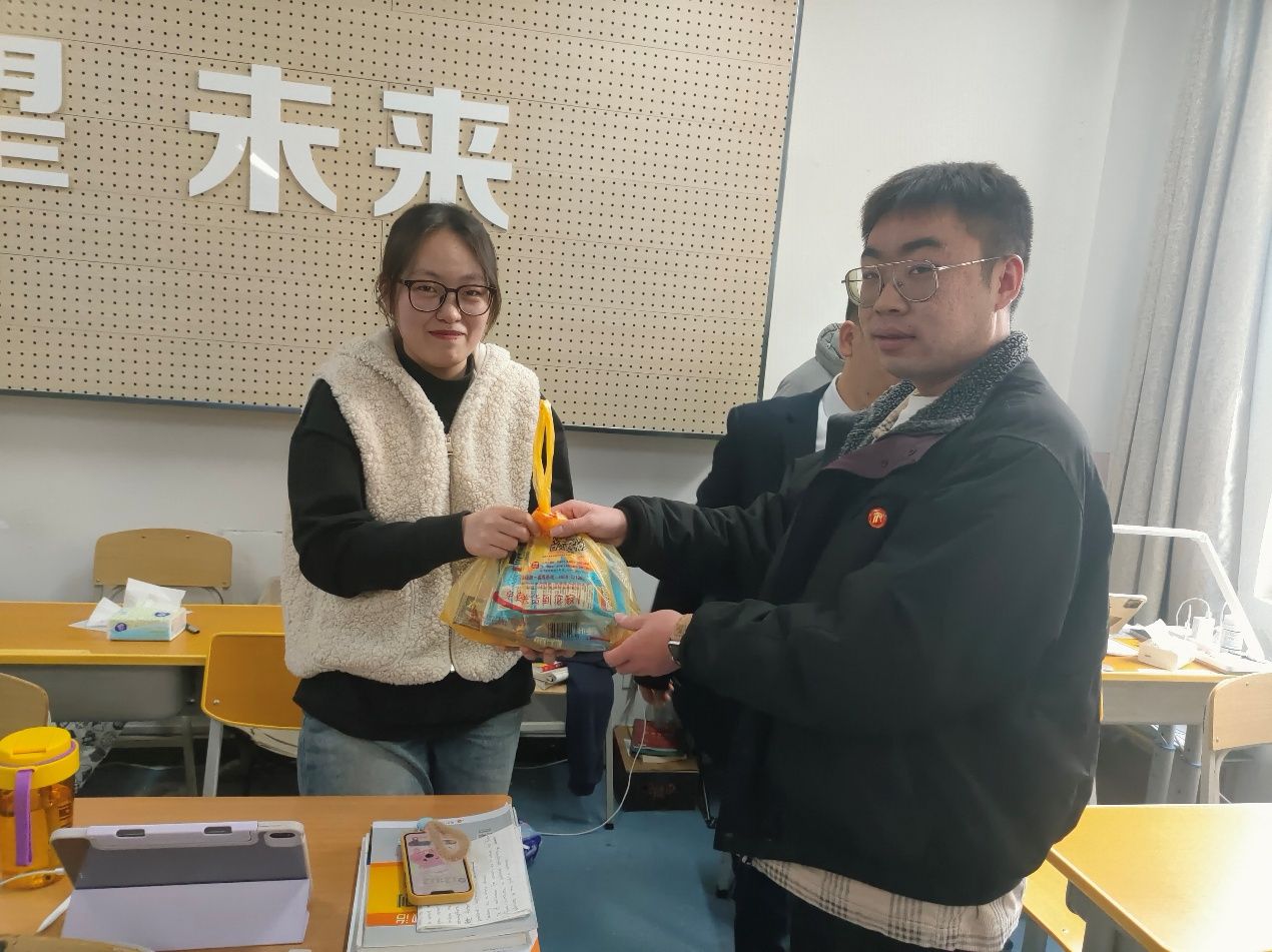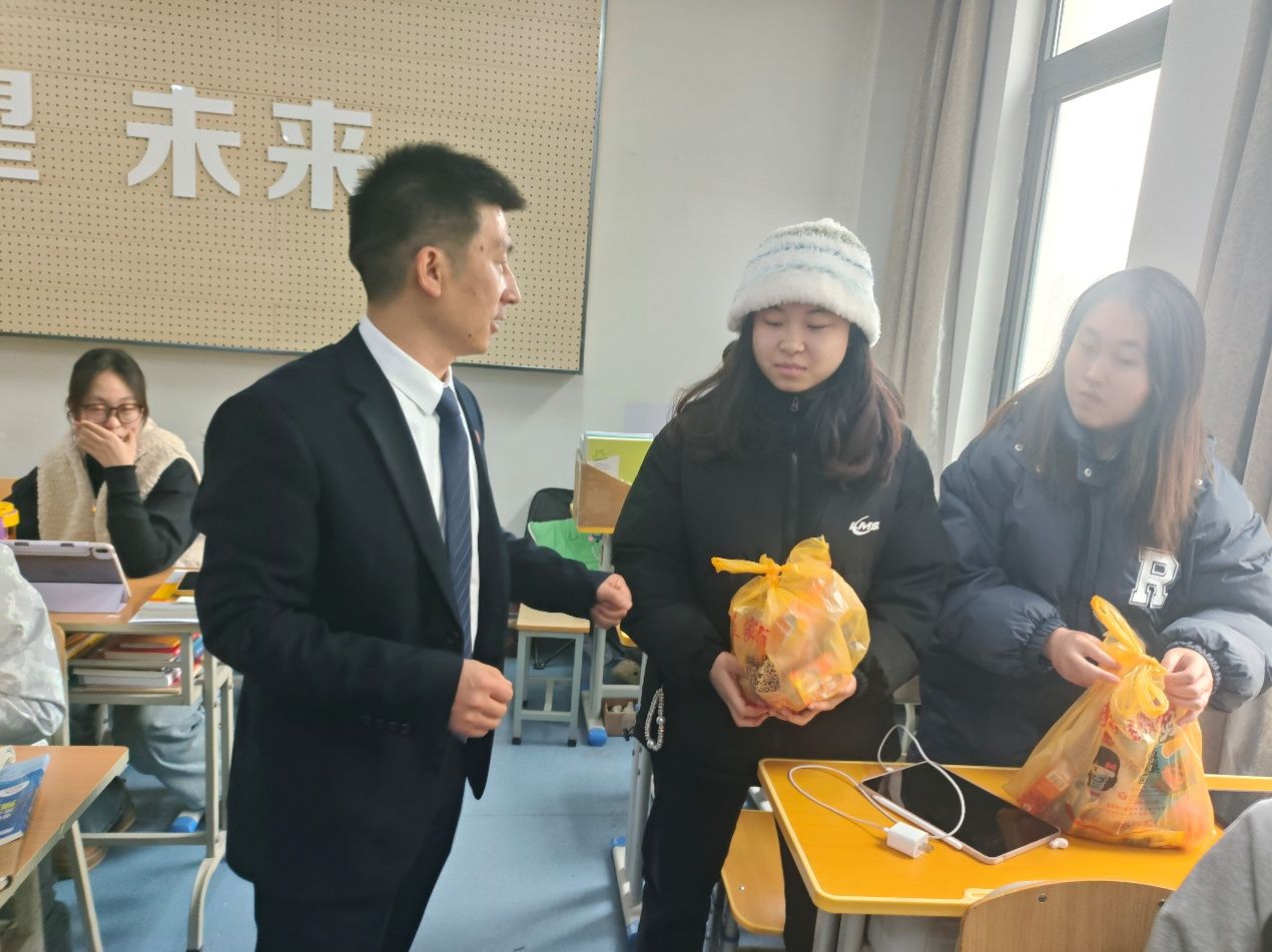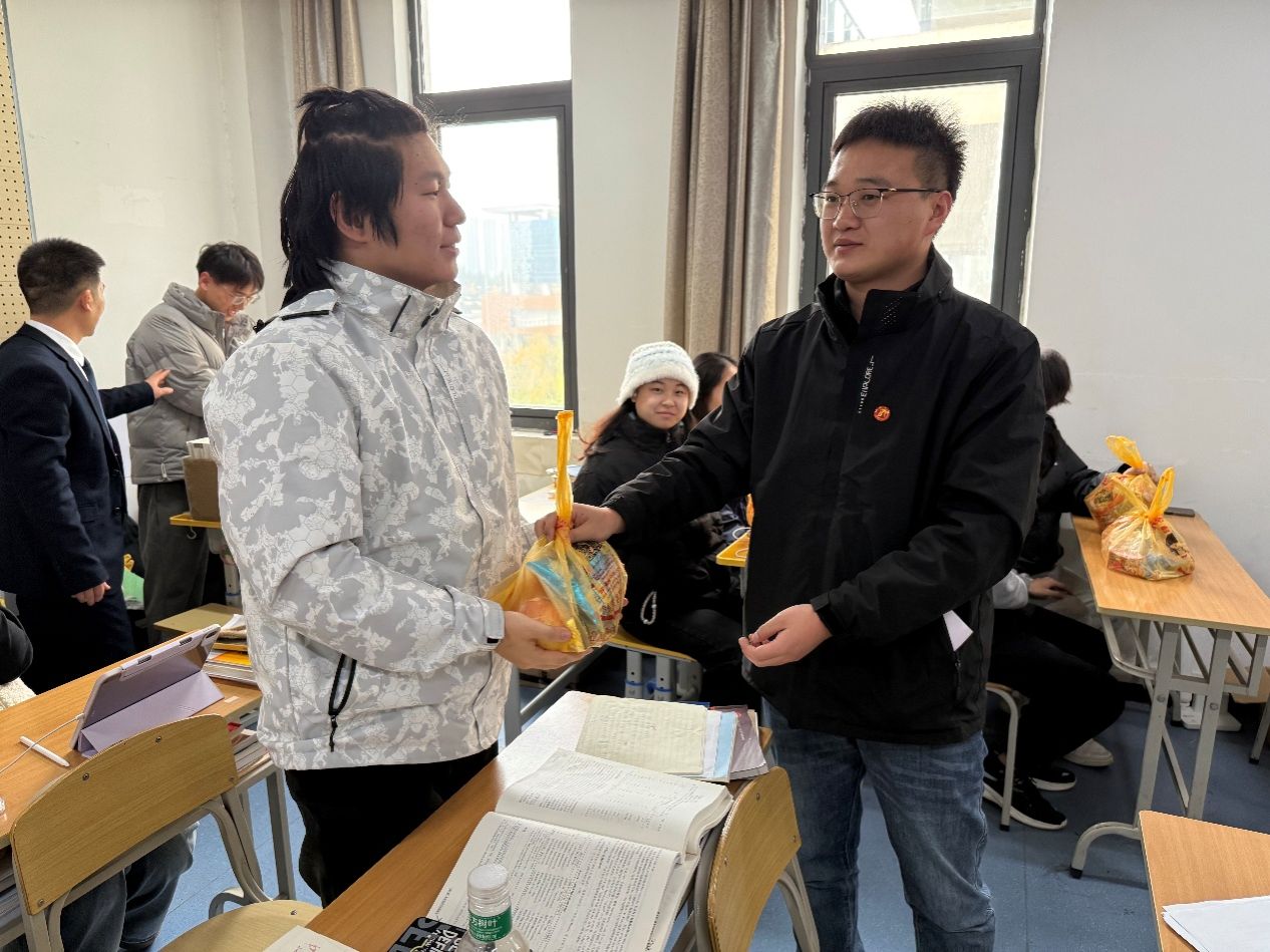 爱心礼包发放期间,党总支书记于咏梅希望全体考研同学,在备考冲刺阶段要保持平和和坚韧的心态,劳逸结合,规律作息,合理饮食,以最佳状态迎接考试。经理陈守满肯定了各位学子从开始准备考研以来付出的所有努力,鼓励同学们要咬定青山不放松,在最后的冲刺阶段咬紧牙关,坚持到底,为考研之路画上圆满句号。副经理王克刚提醒同学们要根据自身情况合理调整复习策略,确保备考过程科学高效。他鼓励大家树立信心,勇于拼搏,用奋斗换取心中理想的目标。党总支副书记蔡正旺叮嘱同学们在专注学业的同时,也务必关注自己的身心健康,保持良好的状态迎接挑战。