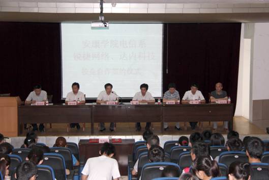 6月21下午,在1号教学楼6楼报告厅隆重举行电信系与锐捷网络、达内科技校企合作签字仪式。公司副董事长陈刚教授、锐捷网络西北大区市场总监史光耀、达内科技陕西中心主任陈相峰、教务处处长钟生海、电信系主任张东红、党总支书记李红兵和电信系全体教师,计算机、电子信息工程专业200多名员工参加了签字仪式。大会由张东红教授主持。