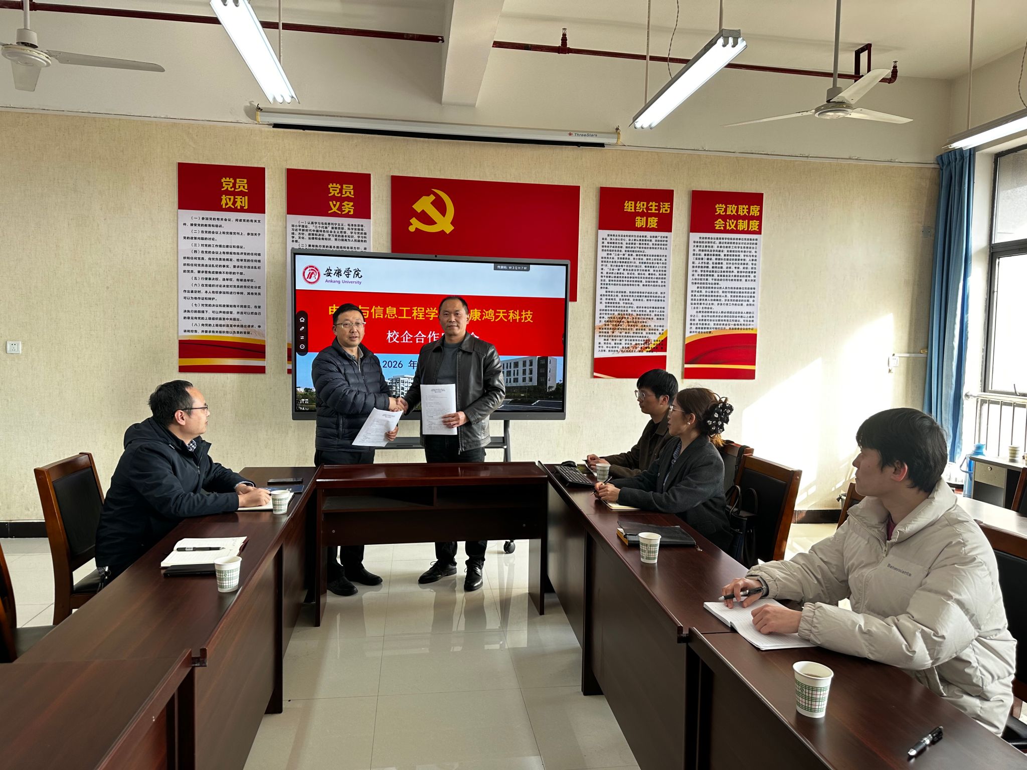 安康鸿天科技股份有限公司代表介绍了企业发展历程、核心技术、业务领域与人才需求,重点分享了在通信系统、物联网、信息安全等领域的技术优势与项目经验。企业负责人表示,将依托自身产业资源与技术平台,为公司提供实践岗位、行业导师与项目支持,共同培养适配产业发展的技术技能人才。会上,双方代表签署了校企合作协议,并围绕人才培养方案优化、实习就业基地共建、产学研项目合作等议题深入交流。