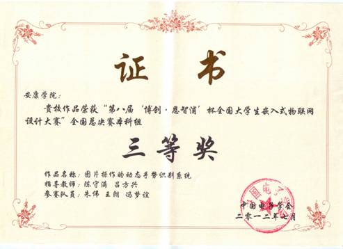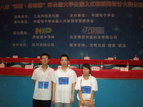 本届大赛在全国设八个分赛区,共计710支队伍报名参赛,经过分赛区严格筛选出100支优秀队伍参加全国总决赛,公司电子与信息工程系电子信息工程2009级员工朱伟、王朗、冯梦谊同学设计,陈守满、吕方兴老师指导的作品《图片操作的动态手势识别系统》代表西北赛区参加全国总决赛,最终获得三等奖的优异成绩。