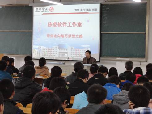 11月7日下午,电信系在江北校区1301教室举行了由陈虎教授主讲的题为“带你走向编写梦想之路”学术报告会,并召开了陈虎软件工作室招收学员动员会。电信系教学副主任陈守满教授、计算机应用教研室老师和12级计算机专业266名员工参加了大会。大会由陈守满教授主持。