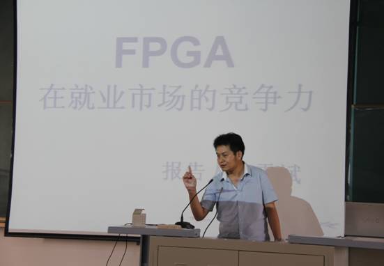 报告会上,李凡高级工程师以80年代硅谷的崛起为切入点,从电子管、晶体管、集成电路、专用集成电路(ASIC)到现场可编程逻辑阵列(FPGA)。介绍了FPGA产生的背景、技术现状、产业链等情况;以智慧地球为例,诙谐生动地阐述了FPGA在通信领域、嵌入式应用、可重构计算等方面的应用与未来发展趋势;以李约瑟难题“为什么进入现代,中国人却远离了发明”和“为什么近代科学没有产生在中国”提出电子硬件设计技术的发展不仅需要改革理念,还需要改革我们自身,以此来改革我们的民族,改革我们的世界。李凡高级工程师指出,FPGA技术正处于蓬勃发展时期,是一个朝阳产业,鼓励师生要树立信心,只有下功夫才能掌握这门技术;李凡高级工程师以屈原的名句“路漫漫其修远兮,吾将上下而求索”与电信系师生共勉。至芯科技公司雷斌总经理为即将毕业的员工分析了FPGA行业的人才需求和就业前景,同时也与参加会议的教师和员工就相关问题进行了深入讨论。
