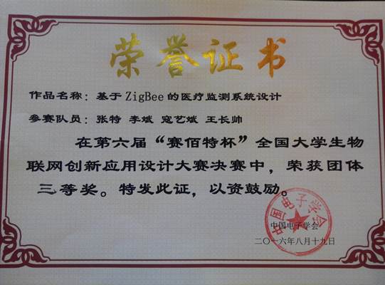 2016第六届“丰台科技园·赛佰特杯”全国老员工物联网创新应用设计大赛决赛于2016年8月19日在北京大红门国际会展中心落幕,电子信息工程公司2013级电子信息工程专业张特、李斌、王长帅、寇艺斌同学设计的作品《基于ZigBee的医疗监测系统设计》荣获全国总决赛三等奖。