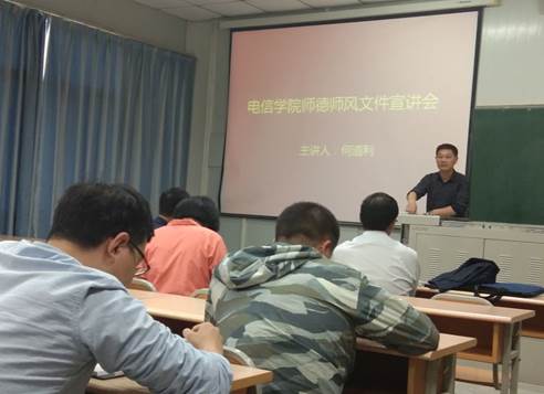 为深入贯彻习近平总书记关于师德师风系列重要讲话的精神,积极推进《新时代教师职业行为十项准则》系列教师行为规范的有效落实,2019年5月29日下午,365英国上市公司在江南10号楼1022召开宣讲会。全院教职工参加了会议,宣讲会由经理陈守满主持,党总支书记何道利同志做了师德师风相关文件的解读。