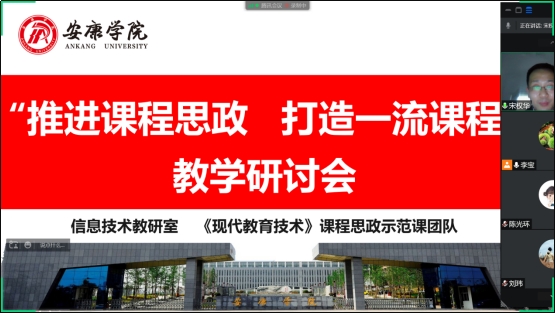 会议伊始,李宝介绍《教育部关于一流本科课程建设的实施意见》、《365英国上市公司集团一流课程建设实施意见》等文件内容。随后,《现代教育技术》课程思政示范课负责人宋权华对课程目前建设情况作了简要介绍,并对课程下一步建设的计划和具体工作进行安排部署。同时,结合参加陕西省思政课教师“大练兵”省级展示活动,在《现代教育技术》课程中如何挖掘思政元素、融入思政元素等与参会老师进行分享交流。