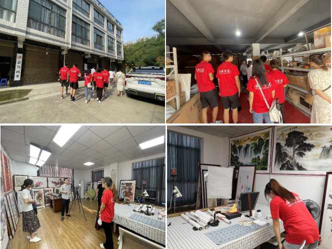 秦邦画业负责人向团队成员详细介绍了建立工厂、联系字画名家、字画装裱、字画网络销售的全部过程。