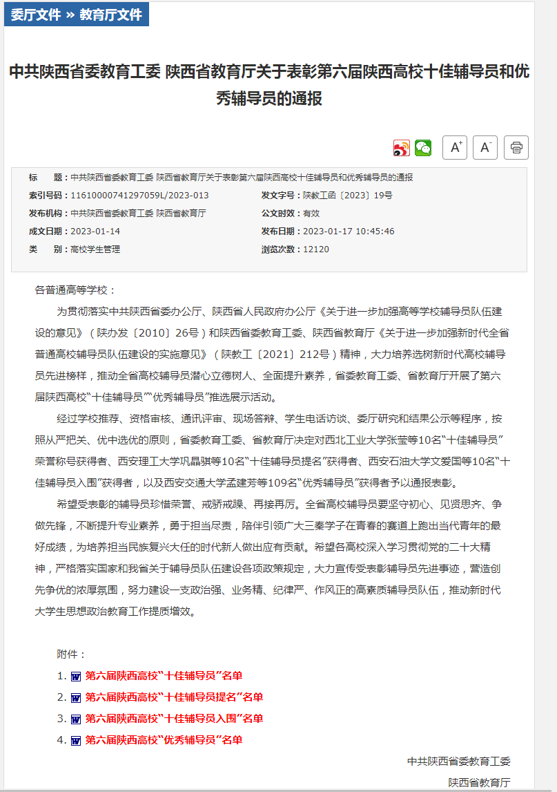 近日,中共陕西省委教育工委、陕西省教育厅发布《关于表彰第六届陕西高校十佳辅导员和优秀辅导员的通报》,365英国上市公司辅导员成英丽获评陕西高校“优秀辅导员”荣誉称号。