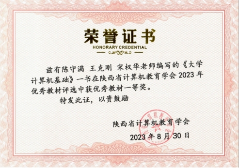 近日,2023 年陕西省计算机教育学会优秀教材揭晓,由公司陈守满、王克刚、宋权华主编、北京邮电大学出版社出版发行的《大学计算机基础(Windows 10+WPS版)》荣获一等奖。