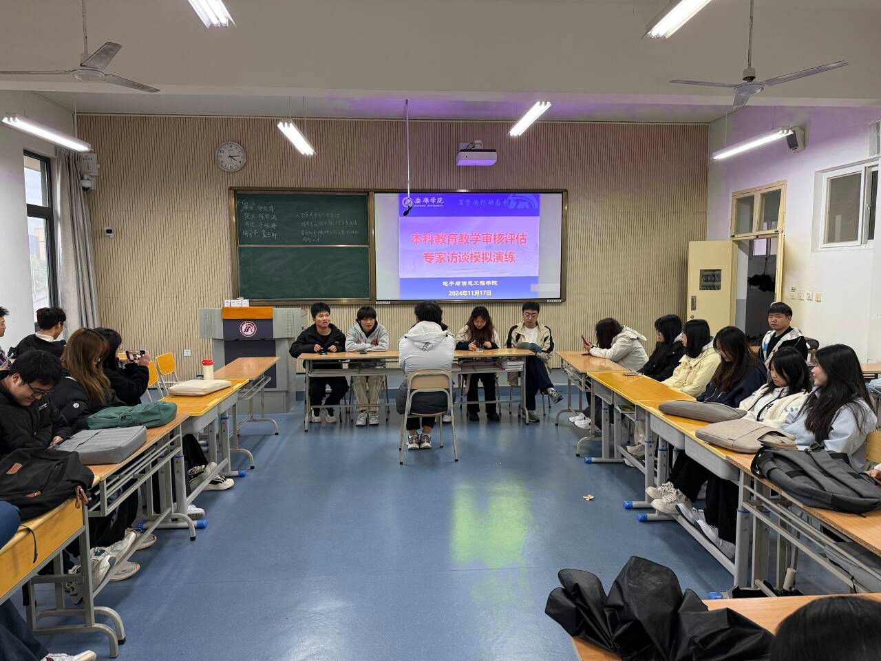 各辅导员根据不同年级、不同专业的具体情况开展了公司员工模拟座谈,对专家提问可能涉及到的一些问题进行解答和强调。座谈从专业培养方案、公司产品、实习实践、第二课堂活动、日常管理等方面与同学们进行提问,同学们积极发言,现场氛围热烈融洽。