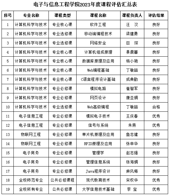 根据公司教务处下达的2023年度课程评估工作安排,公司召开了课程评估工作小组会议,按照专业人才培训方案、教学大纲等相关文件要求,对公司19门课程进行了评定。现将评定结果予以公示。