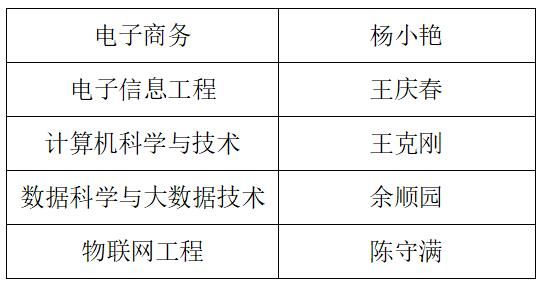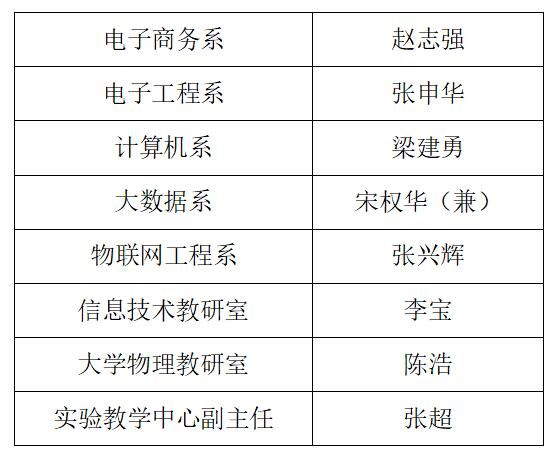 根据公司教务处《关于报送系(教研室)主任 、实验教学中心副主任 、专业负责人和课程(群)负责人名单的通知》,经个人报名、民主推荐、党政联席会审议、党总支会议审定,拟选聘以下人员: